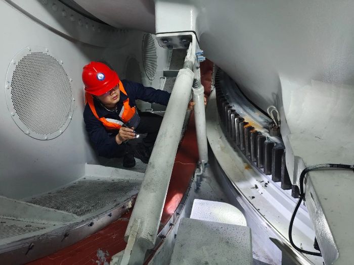 ▲突擊隊(duì)成員在風(fēng)機(jī)機(jī)艙開(kāi)展偏航系統(tǒng)檢查 攝影:郭逸博