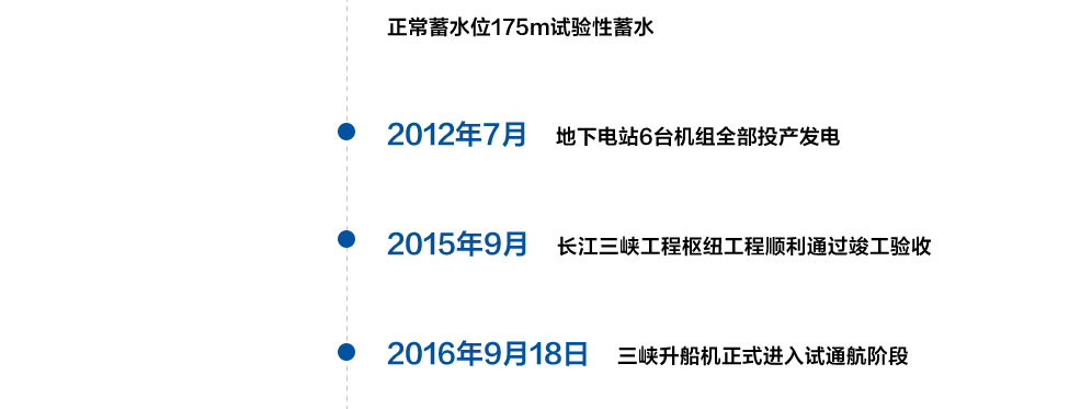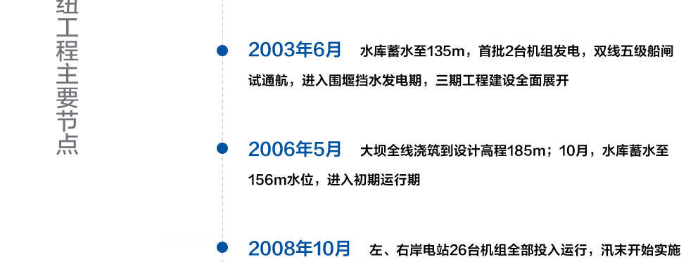 三峽樞紐工程從1993年1月開始施工準備,至2008年10月右岸電站機組全部投產發電,經過16年的努力,除批準緩建的升船機外,提前一年完成初步設計建設任務。