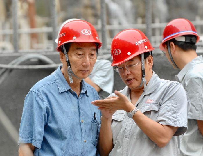 中國(guó)工程院院士、原三峽總公司總經(jīng)理陸佑楣(左)和汪志林在溪洛渡建設(shè)現(xiàn)場(chǎng)討論。