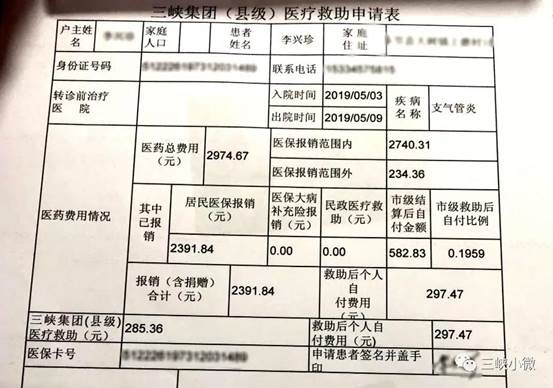 受助患者醫療報銷單據中的三峽集團(縣級)醫療救助申請表