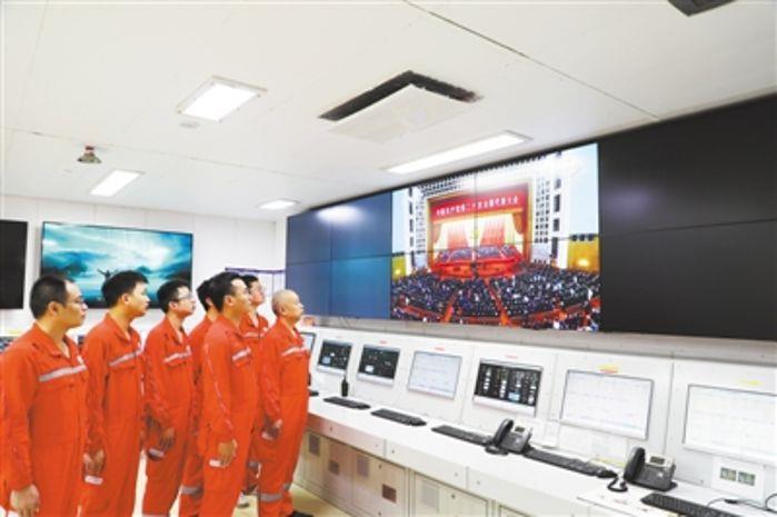 10月16日上午,“深海一號”氣田持續(xù)穩(wěn)定生產(chǎn)作業(yè),現(xiàn)場員工100余人在氣田黨員活動室、餐廳、中控室收看黨的二十大開幕直播。