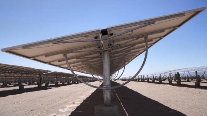 走在“領跑者”項目的園區內,不時會聽到一陣陣電機工作的“嗡嗡”聲,這是光伏支架跟隨太陽而轉動的聲音。與傳統的固定支架相比,采用這些固定可調式支架和水平單軸跟蹤式支架,可以讓光伏板跟蹤對準太陽,最大程度獲取陽光在電池面板的垂直分量,日平均發電量得以提高約11%,系統度電成本降低了。