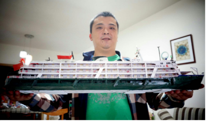 ▲?長江船舶愛好者王軒和他制作的“江渝4”號客輪模型。此船換色改名后,現(xiàn)收藏于奉節(jié)縣詩城博物館
