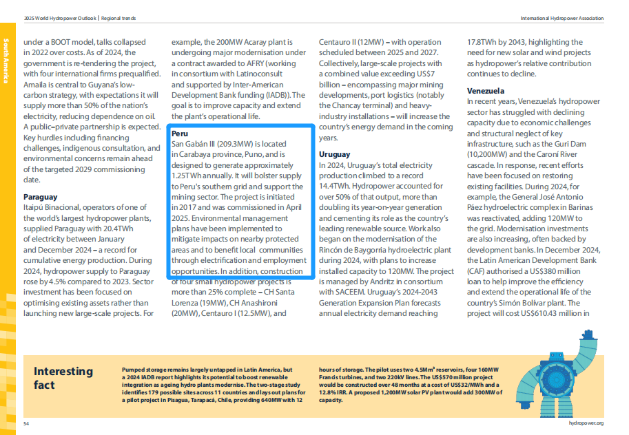 本年度報告封面選用了三峽集團長龍山抽水蓄能電站上水庫圖片,展現工程壯麗實景。同時,長龍山抽水蓄能電站、天臺抽水蓄能電站項目作為典型案例在“抽水蓄能建設:投資系統韌性”章節呈現,展示項目在技術創新實踐、改善電網運行條件、促進構建清潔高效電力系統方面的綜合效益。“南美發展趨勢”章節介紹了三峽集團秘魯圣加旺Ⅲ水電站項目年發電量可達1.25太瓦時,將對提升秘魯南部電網電力供應、支持礦業發展以及促進當地社區電氣化和就業等方面發揮積極作用。