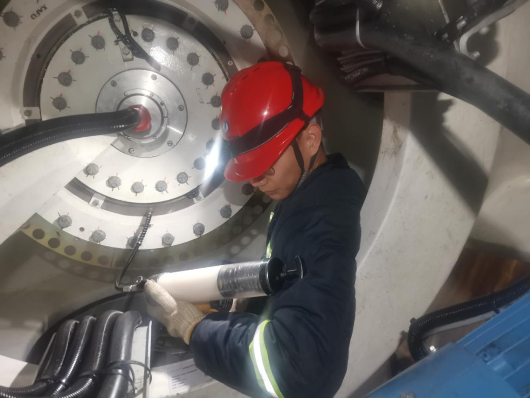 找到了故障原因,消缺工作迅速啟動。問題又來了:更換制動器內部密封圈按照廠家的指導書操作就可以,但打磨偏航系統剎車盤是此前沒有遇到過的,在圓環狀盤體上精準打磨0.5毫米,這對操作的精度要求很高。