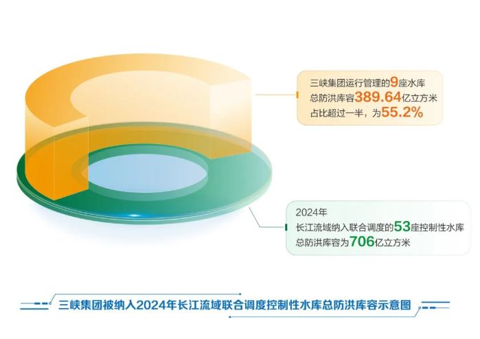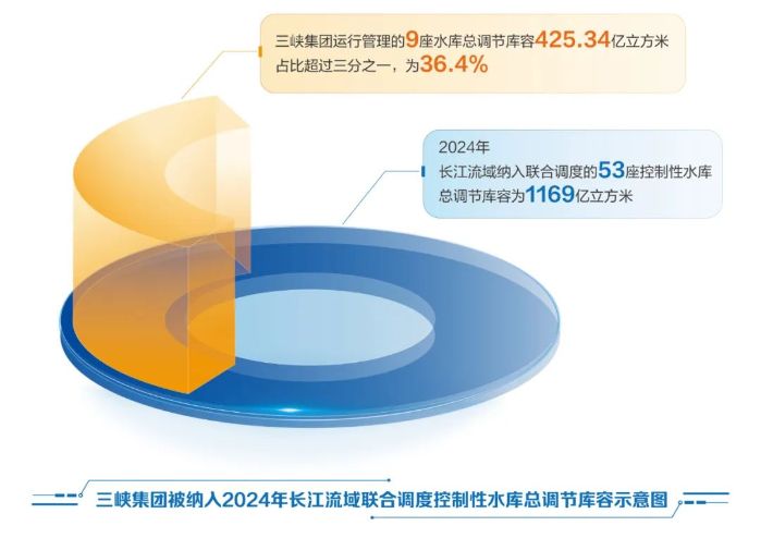 2024年,長(zhǎng)江流域納入聯(lián)合調(diào)度的水工程中,控制性水庫(kù)共53座,總調(diào)節(jié)庫(kù)容為1169億立方米,總防洪庫(kù)容為706億立方米。三峽集團(tuán)運(yùn)行管理的這9座水庫(kù)總調(diào)節(jié)庫(kù)容為425.34億立方米,占比36.4%;總防洪庫(kù)容為389.64億立方米,占比55.2%。