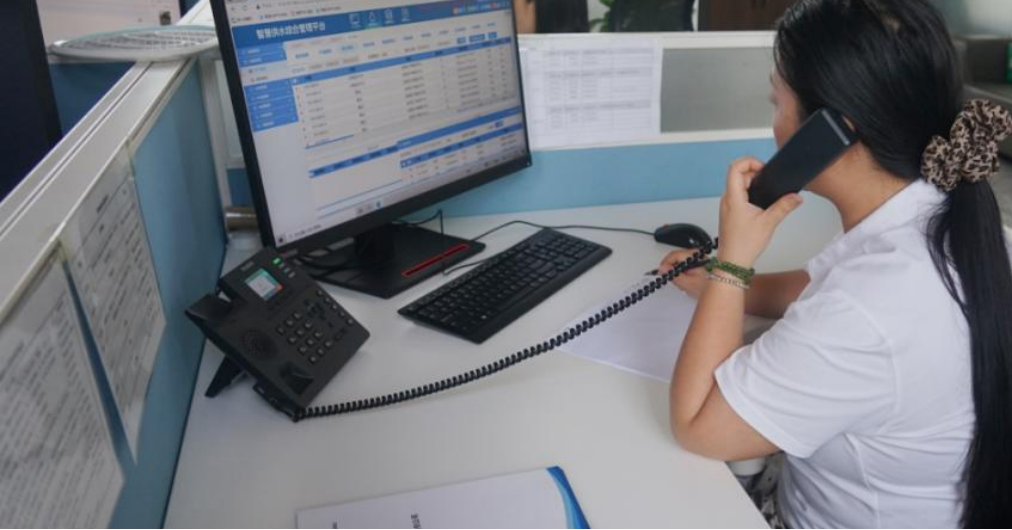 叮鈴鈴,調(diào)控中心電話鈴聲響起。三聲內(nèi),客服人員劉茜迅速接起:“您好,這里是水管家熱線,請(qǐng)講。”放下電話,劉茜將信息上傳系統(tǒng)并進(jìn)行分發(fā)派單,“用戶反饋家中水壓低,已反饋東新城營業(yè)所處理。”