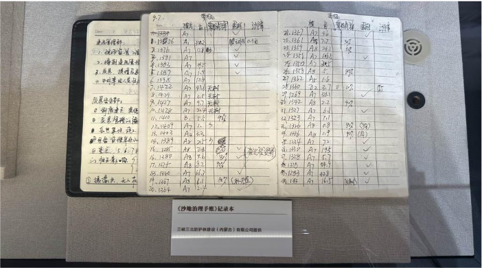 ▲?在三峽工程博物館展出的《沙地治理手賬》記錄本??攝影:毛慶